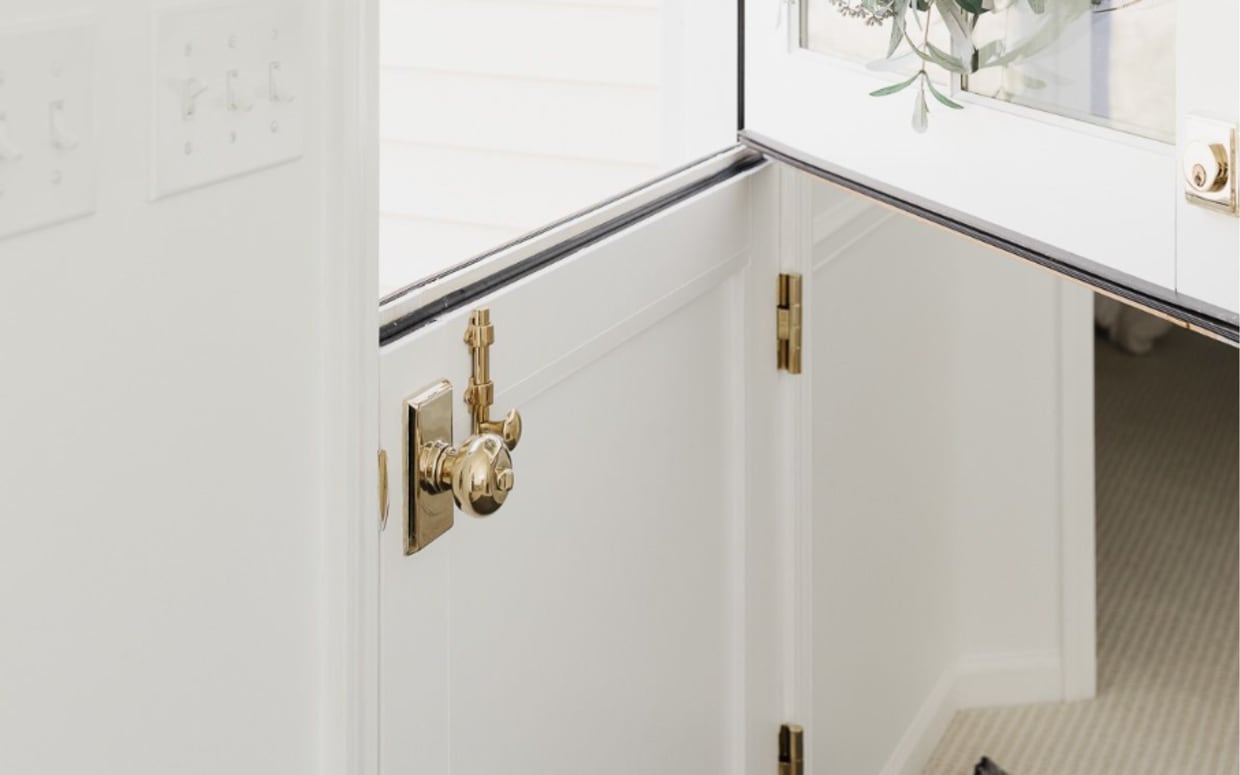 Dutch Door Bolt in Unlacquered Brass (with Square Deadbolt and Key in Providence Knob). Design and Photography by Julie Blanner.