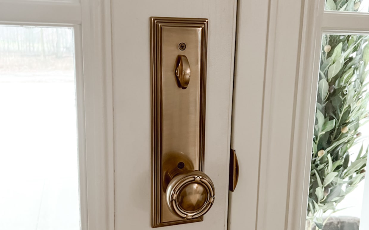 Shown here: Ribbon and Reed Knob (on the interior side of a Melrose Entry Set in French Antique.) Design byDeb and Danielle.
